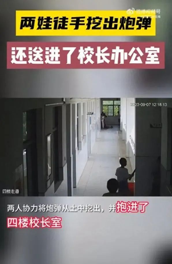 民警經(jīng)過調(diào)查發(fā)現(xiàn),當(dāng)日中午,兩名學(xué)生玩耍時在一處樹林內(nèi)發(fā)現(xiàn)該枚炮彈,隨后兩人協(xié)力將炮彈從土中挖出,并抱到了四樓校長室,老師發(fā)現(xiàn)后立即報警。