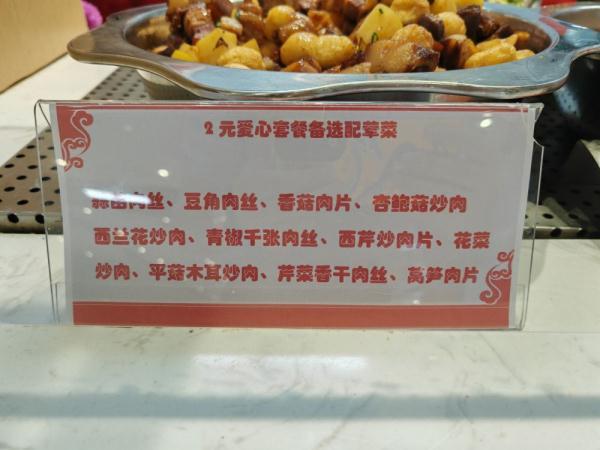 記者注意到,大伙快餐窗口銷售的每樣菜品都用紅、黃、綠等顏色的標簽注明價格和克重,“愛心菜”則用藍色標簽。在“2元愛心套餐窗口”前,還有一塊告示牌,注明了蒜苗肉絲等11種備選葷菜。