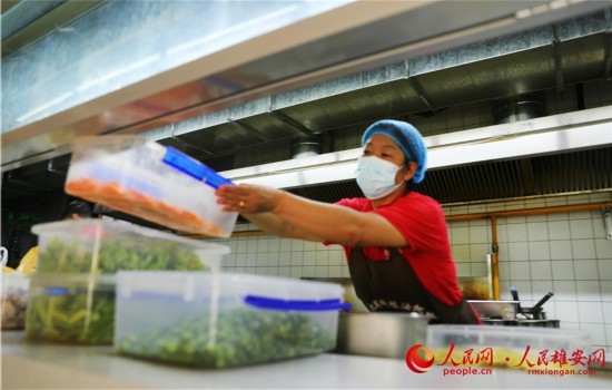 臨近飯點,荊冬英正在社區食堂進行配菜。 人民網記者李雪晴攝