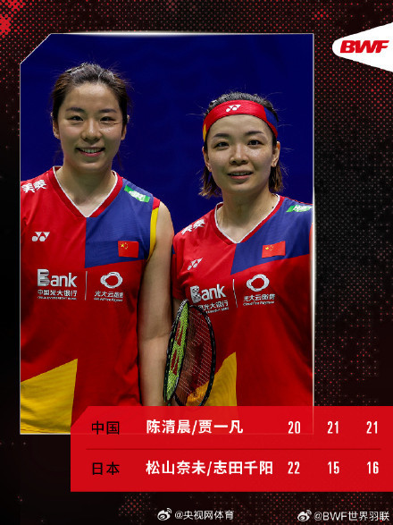 2023年中國羽毛球公開賽女雙半決賽,陳清晨 /賈一凡20-22、21-15、21-16戰勝日本組合松山奈未/志田千陽,晉級決賽。