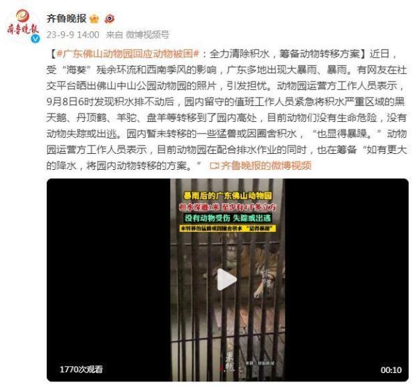 近日,受“海葵”殘余環流和西南季風的影響,廣東多地出現大暴雨、暴雨。有網友在社交平臺曬出佛山中山公園動物園的照片,引發擔憂。動物園運營方工作人員表示,9月8日6時發現積水排不動后,園內留守的值班工作人員緊急將積水嚴重區域的黑天鵝、丹頂鶴、羊駝、盤羊等轉移到了園內高處,目前動物們沒有生命危險,沒有動物失蹤或出逃。園內暫未轉移的一些猛獸或因圈舍積水,“也顯得暴躁。”動物園運營方工作人員表示,目前動物園在配合排水作業的同時,也在籌備“如有更大的降水,將園內動物轉移的方案。”