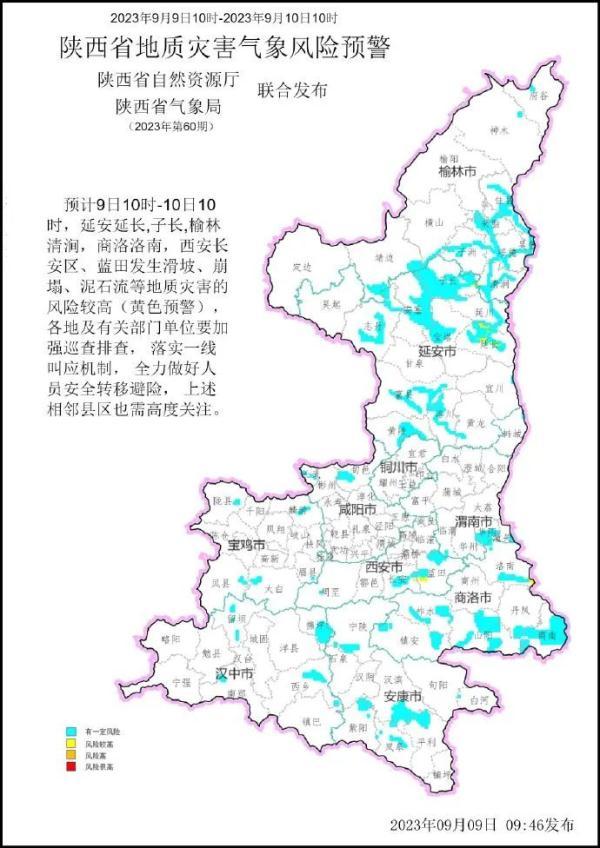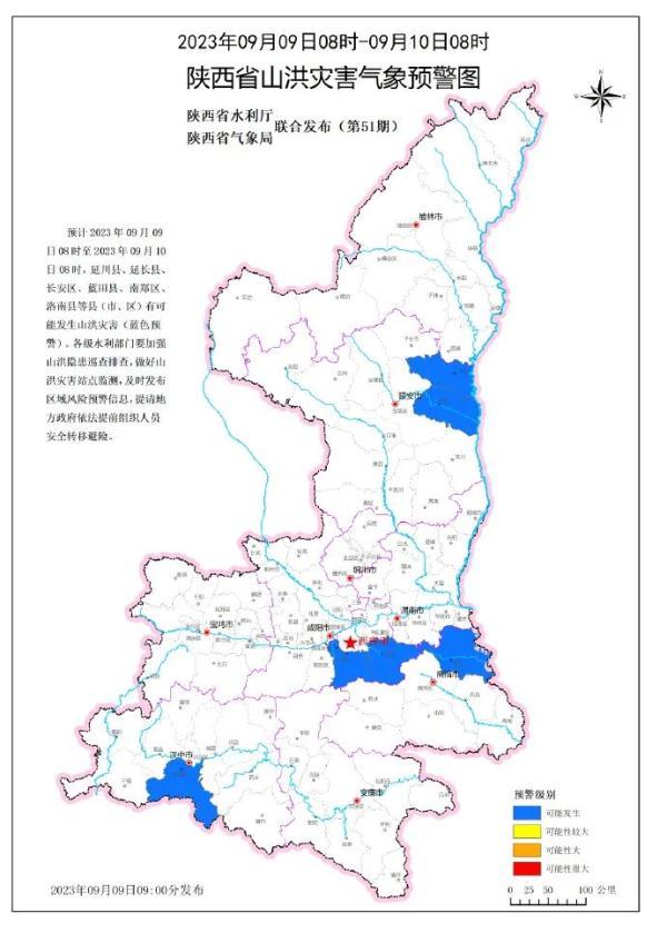 陜西省水利廳與陜西省氣象局聯合發布山洪災害氣象預警預計2023年09月09日08時至2023年09月10日08時,延川縣、延長縣、長安區、藍田縣、南鄭區、洛南縣等縣(市、區)有可能發生山洪災害(藍色預警)。各級水利部門要加強山洪隱患巡查排查,做好山洪災害站點監測,及時發布區域風險預警信息,提請地方政府依法提前組織人員安全轉移避險。