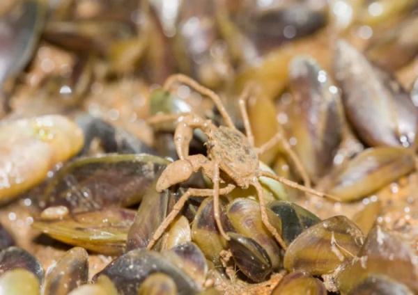 2021年12月,武漢水生生物專家在天興洲進(jìn)行野外調(diào)查時,掀開一塊石頭后,偶然在大量貽貝中間發(fā)現(xiàn)這種形如蜘蛛的小螃蟹。