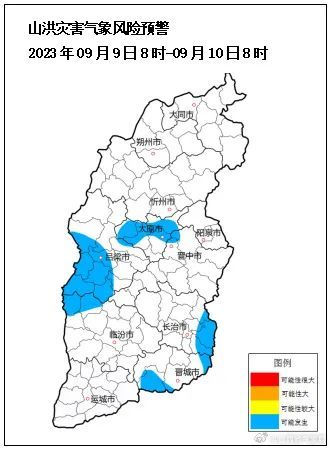山西省水利廳和山西省氣象局聯合發布山洪災害氣象風險預警:預計,2023年9月9日8時至9月10日8時,受強降雨影響,我省太原北部、呂梁西南部、臨汾北部、長治東部和晉城南部可能發生山洪(藍色預警)。