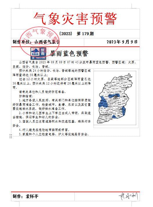 山西省氣象臺2023年09月09日07時45分發布暴雨藍色預警,預警區域:太原、呂梁、臨汾、長治、晉城。