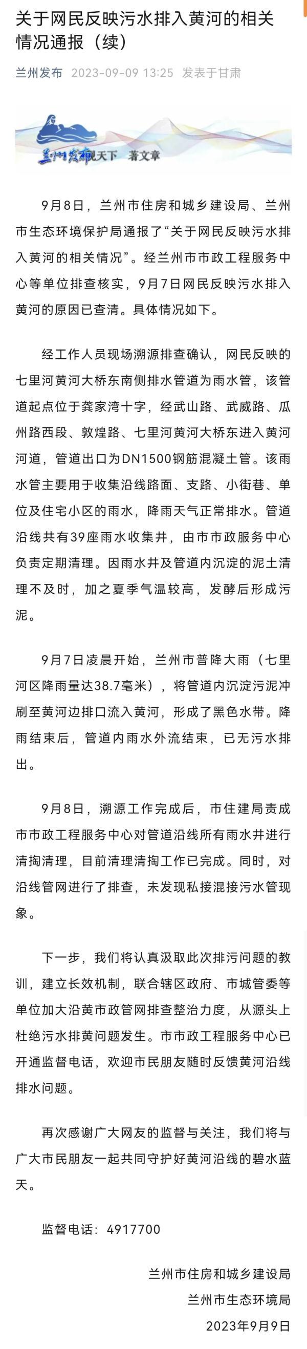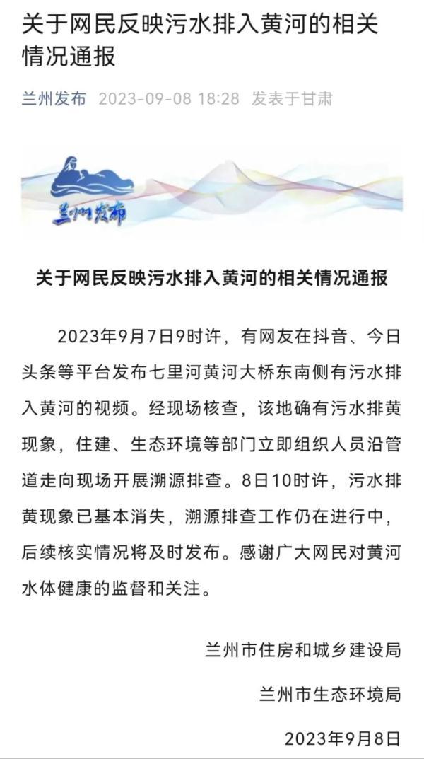 9月8日傍晚,蘭州市住房和城鄉建設局、蘭州市生態環境局發布通報:經現場核查,該地確有污水排黃現象,住建、生態環境等部門立即組織人員沿管道走向現場開展溯源排查。8日10時許,污水排黃現象已基本消失。