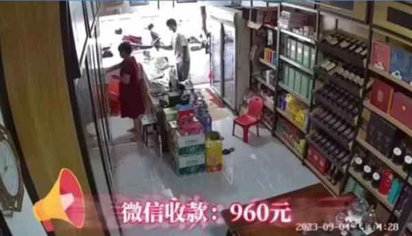 在店主拿著塑料袋裝煙的時候,男子在背后拿出手機裝模做樣的付款,然后音響再次響起:“微信收款960元?!?/p>