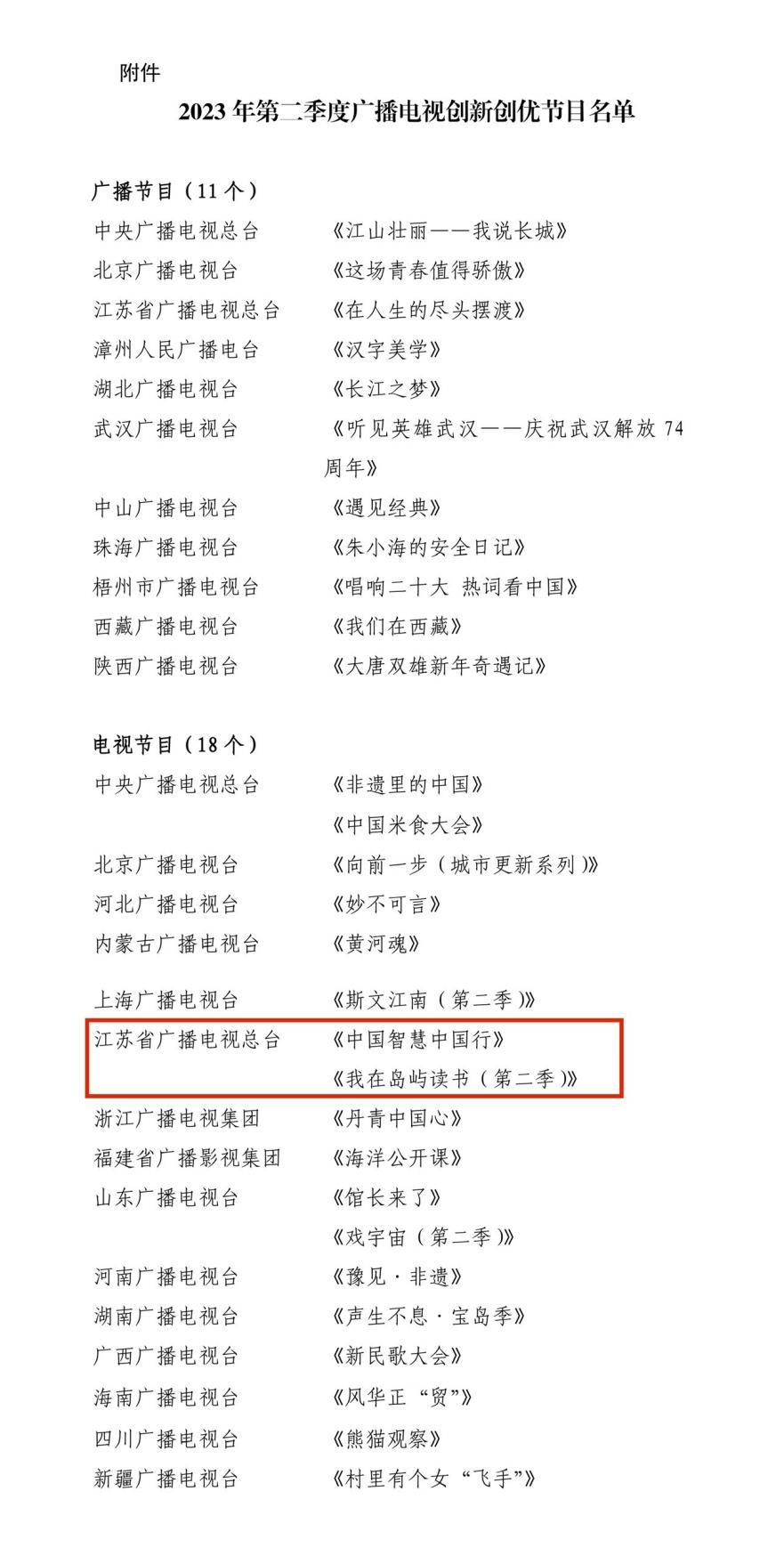 近日,國家廣播電視總局發布通知公布2023年第二季度廣播電視創新創優節目名單,《中國智慧中國行》和《我在島嶼讀書2》成功入選。名單上的優秀節目,主旋律響亮、正能量飽滿、藝術精湛、制作精良,產生了良好社會反響。通知指出,各級廣播電視播出機構要認真學習借鑒創新創優節目的好做法、好經驗,聚焦新時代新征程,弘揚中華優秀傳統文化,守正創新、奮發有為,創作生產播出更多展現時代風貌、中國精神的精品佳作,滿足人民文化需求,增強人民精神力量,為建設文化強國、建設中華民族現代文明貢獻力量。