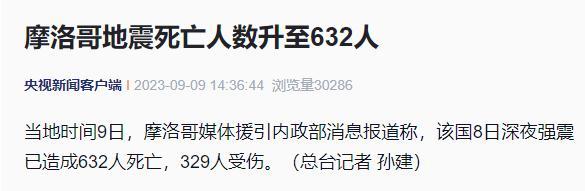 據央視新聞客戶端消息,當地時間9日,摩洛哥媒體援引內政部消息報道稱,該國8日深夜強震已造成632人死亡,329人受傷。
