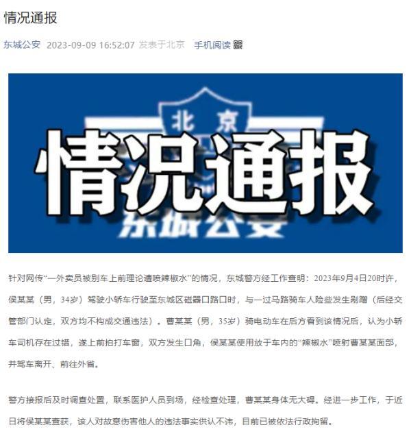 據東城公安消息,針對網傳“一外賣員被別車上前理論遭噴辣椒水”的情況,東城警方經工作查明:2023年9月4日20時許,侯某某(男,34歲)駕駛小轎車行駛至東城區磁器口路口時,與一過馬路騎車人險些發生剮蹭(后經交管部門認定,雙方均不構成交通違法)。曹某某(男,35歲)騎電動車在后方看到該情況后,認為小轎車司機存在過錯,遂上前拍打車窗,雙方發生口角,侯某某使用放于車內的“辣椒水”噴射曹某某面部,并駕車離開、前往外省。