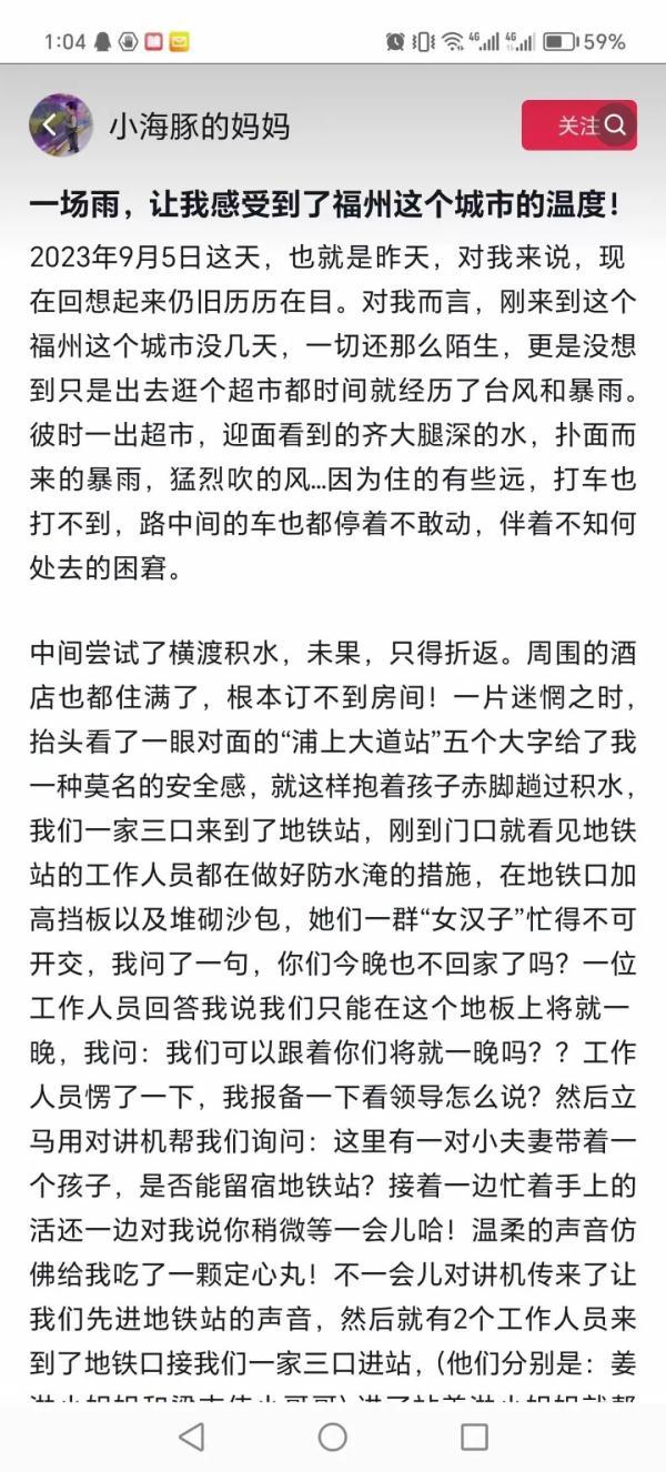 太謝謝你們了,我們剛從深圳來福州幾天,今晚從超市買完東西出來,突然遭遇暴雨,積水到大腿深,住的有些遠,打車也打不到,路中間的車也都停著不敢動。我們嘗試了橫渡積水,未果只得折返。周圍的酒店也都住滿了,根本訂不到房間,從來沒經歷過這種情況,不知道怎么辦才好,多虧有你們。