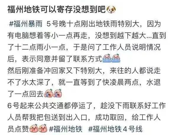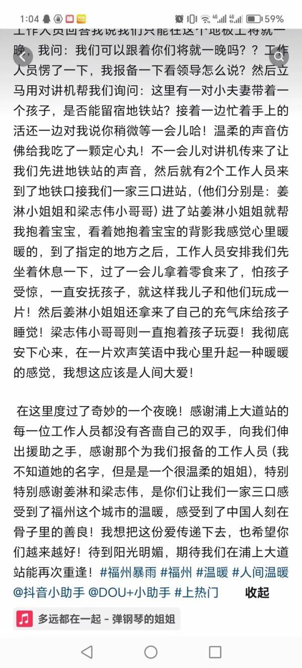 在這里度過了奇妙的一個夜晚!感謝浦上大道站的每一位工作人員都沒有吝嗇自己的雙手,向我們伸出援助之手,感謝那個為我們報備的工作人員(我不知道她的名字,但是是一個很溫柔的姐姐),特別特別感謝姜淋和梁志偉,是你們讓我們一家三口感受到了福州這個城市的溫暖,感受到了中國人刻在骨子里的善良!我想把這份愛傳遞下去,也希望你們越來越好!待到陽光明媚期待我們在浦上大道站能再次相逢!