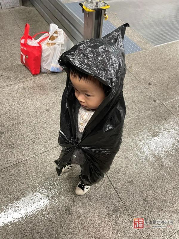 當時一位男士雙手拎著東西,一位女士牽著一個一歲多的小寶寶。大人們都挽著褲腳,全身濕透,小寶寶身上也披著黑色塑料袋做成的雨衣。