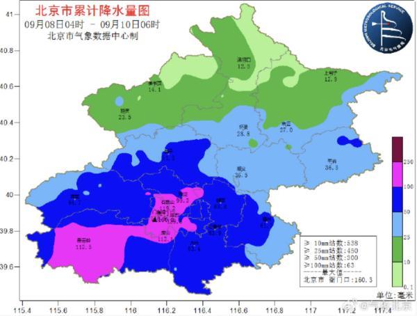 今晨6時20分,北京市氣象臺發布8日4時至10日6時降水量(毫米):全市平均57.2,城區平均(朝,海,豐,石,東,西)88.6,西南(門,房)85.6,東南(通,大)58.8,西北(延,昌)32.5,東北(密,順,平,懷)26.6;城區和全市最大石景山衙門口160.3,最大小時降水強度昌平大辛峰43.5毫米/小時(8日18時-19時)。