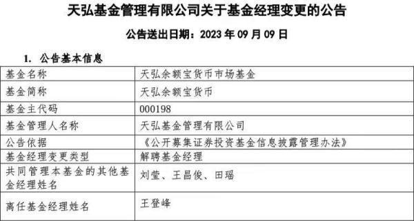 9月9日,天弘基金發(fā)布公告稱,公司旗下天弘余額寶貨幣基金發(fā)生基金經(jīng)理變更。根據(jù)公告,原基金經(jīng)理王登峰因個人原因離任,由劉瑩、王昌俊、田瑤三位基金經(jīng)理共同管理。