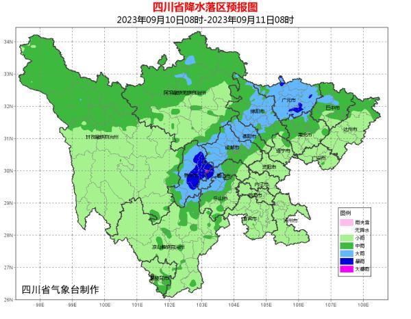11日白天到晚上:盆地各市陰天有陣雨或雷雨,雨量中到大雨,北部部分地方和南部局部地方有暴雨,個別大暴雨,盆地部分地方有4—6級偏北風,山口河谷風力可達7級或以上;川西高原和攀西地區陰天有陣雨或雷雨,雨量小到中雨,局部大雨。