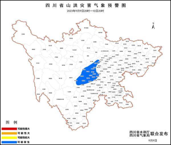 9月9日17時,四川省水利廳、四川省氣象局聯合發布山洪災害藍色預警。