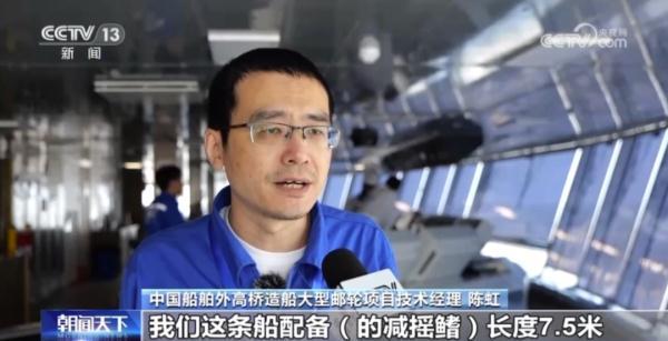 船會發生三個維度的晃動,橫搖、縱搖、垂向的晃動。我們這條船配備的減搖鰭,長度7.5米,單片面積達到22平方米。在海浪當中通過流體動力學,我們控制鰭的方向,可以減少88%的搖晃,基本上感覺不到搖晃了。