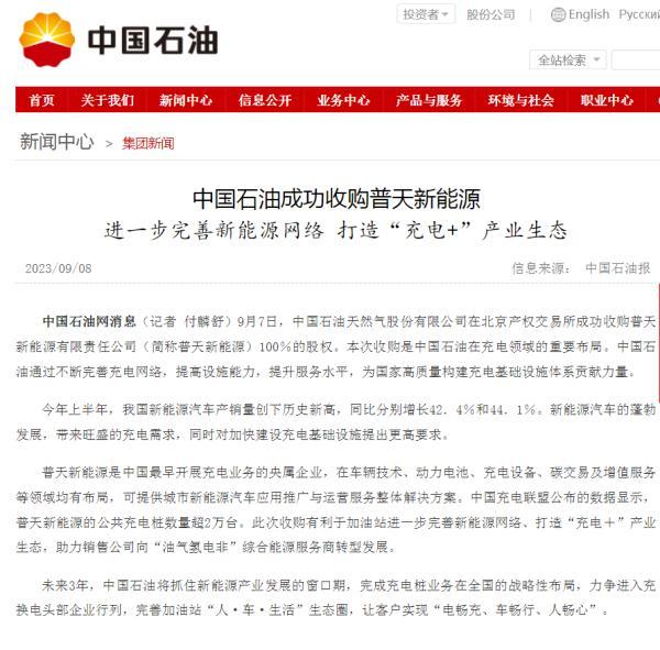 據(jù)中國石油官網(wǎng)消息,9月7日,中國石油天然氣股份有限公司在北京產(chǎn)權(quán)交易所成功收購普天新能源有限責(zé)任公司(簡稱普天新能源)100%的股權(quán)。中國石油表示,本次收購是中國石油在充電領(lǐng)域的重要布局,有利于加油站進一步完善新能源網(wǎng)絡(luò)、打造“充電+”產(chǎn)業(yè)生態(tài),助力銷售公司向“油氣氫電非”綜合能源服務(wù)商轉(zhuǎn)型發(fā)展。