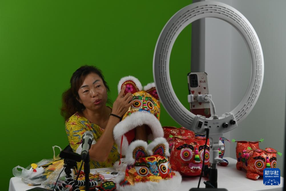 9月8日,在寶雞西秦刺繡文化產業園,千陽繡娘在直播間推廣刺繡手工藝品。陜西千陽縣是國家級非物質文化遺產“西秦刺繡”的重要發祥地和傳承地。近年來,千陽縣將西秦刺繡作為助農增收的重要產業,推動非遺項目產業化發展,助力鄉村振興。