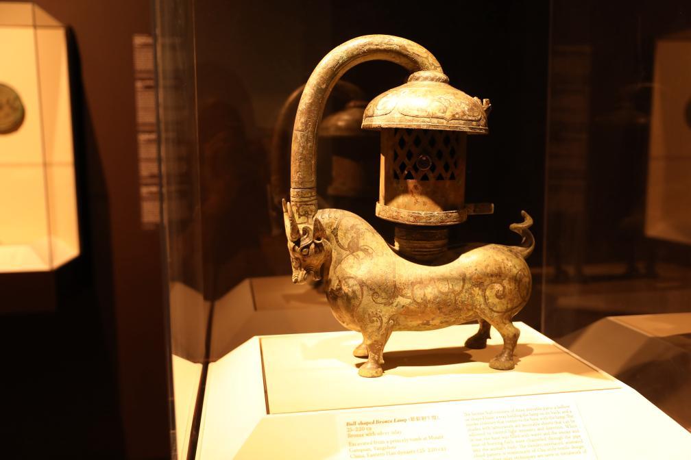 這是9月6日在美國俄亥俄州克利夫蘭藝術(shù)博物館“人間天堂:中國江南珍寶展”上展出的漢代錯銀銅牛燈。新華社記者施春攝