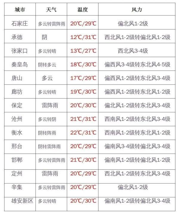 今天白天到夜間,全省多云轉陰,張家口南部、唐山、秦皇島和保定、廊坊及以南地區有雷陣雨或陣雨,局地有中雨,雷雨時局地伴有短時強降水、短時大風、冰雹等強對流天氣。最高溫度,張家口北部和西部、承德北部、保定西北部19~26℃,其他地區27~31℃。最低溫度,張家口、承德、保定西北部3~14℃,其他地區15~21℃。