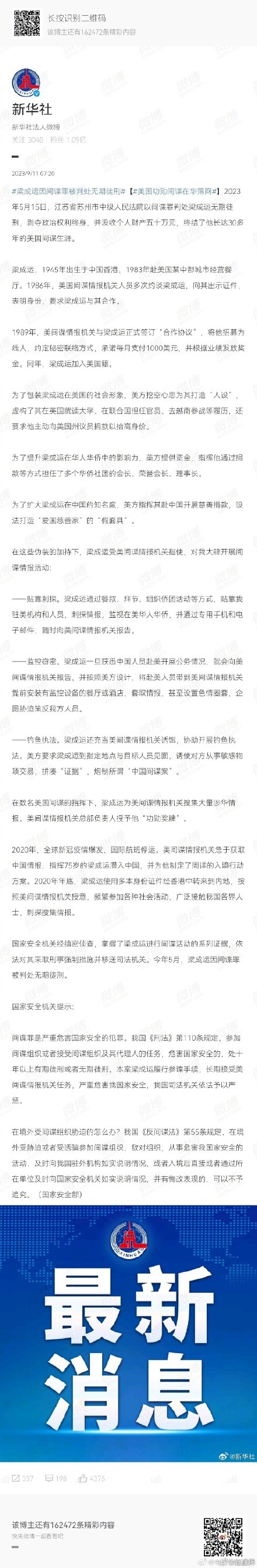 2023年5月15日,江蘇省蘇州市中級人民法院以間諜罪判處梁成運無期徒刑,剝奪政治權利終身,并沒收個人財產五十萬元,終結了他長達30多年的美國間諜生涯。
