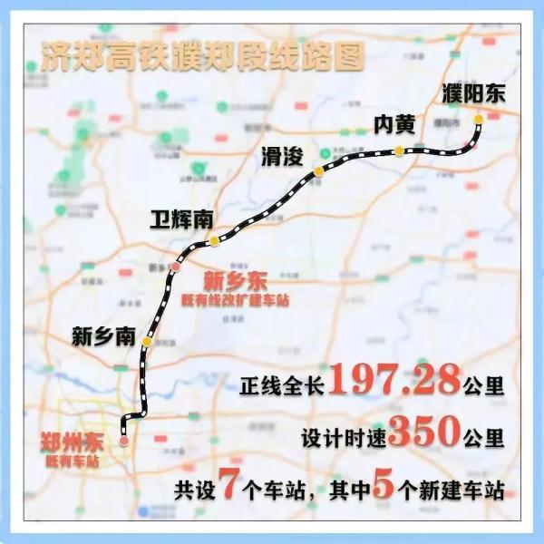 濟鄭高鐵線路全長約407公里,濮鄭段線路全長約197公里,已于2022年6月20日開通運營;濟濮段線路全長約210公里,其中山東段全長約170公里,濮陽至魯豫省界段約40公里。
