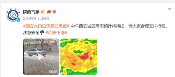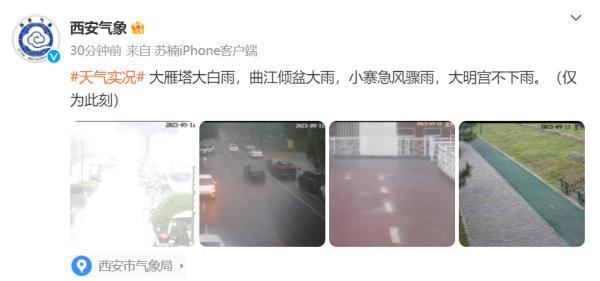 西安市氣象臺2023年9月11日11時發(fā)布暴雨橙色預(yù)警信號:目前西安市灞橋區(qū)局地降水已超過20毫米且降雨持續(xù),預(yù)計碑林區(qū)、雁塔區(qū)、灞橋區(qū)未來3小時內(nèi)降雨量將達(dá)50毫米以上(暴雨橙色),新城區(qū)、蓮湖區(qū)、未央?yún)^(qū)、鄠邑區(qū)、西咸新區(qū)未來6小時降雨量將達(dá)50毫米以上(暴雨黃色),相關(guān)地區(qū)引發(fā)城市內(nèi)澇、中小河流洪水等風(fēng)險高,請注意防范。