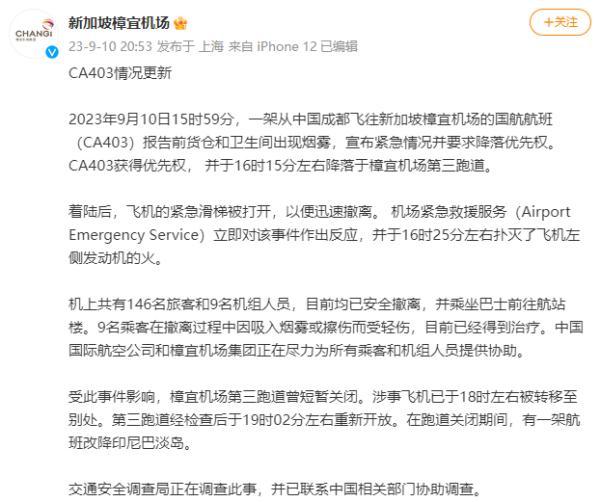 9月10日,從成都天府機場飛往新加坡樟宜機場的CA403航班,機型為A320neo,飛機號B-305J。機上共有旅客146名、機組人員9名。飛機在著陸前客艙出現煙霧,機組按程序處置,飛機于北京時間16時14分降落新加坡樟宜機場,落地后機組組織旅客實施緊急撤離,新加坡樟宜機場啟動了應急程序。人機安全。