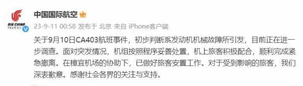 9月11日凌晨,中國國際航空官方微博再次發布通報稱,關于9月10日CA403航班事件,初步判斷系發動機機械故障所引發,目前正在進一步調查。在樟宜機場的協助下,已做好旅客安置工作。對于受到影響的旅客,深表歉意。