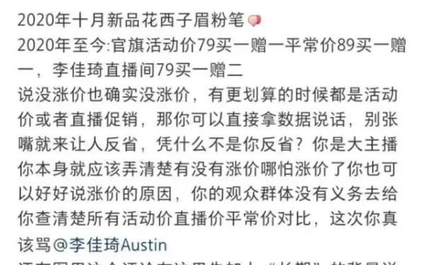 近日,李佳琦在直播活動中介紹79元一支的花西子眉筆時,看到有網友留言說越來越貴了,他反問:“哪里貴了?這么多年都是這個價格,不要睜著眼睛亂說,國貨品牌很難的……哪里貴了?”