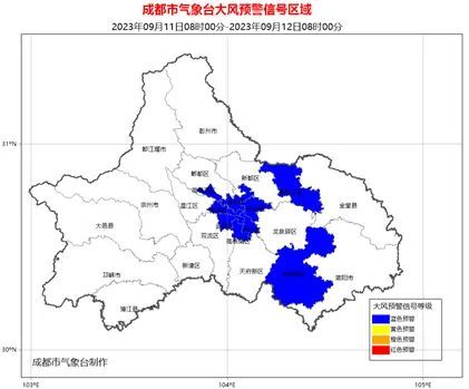 成都市氣象臺2023年9月11日08時00分發布大風藍色預警信號:預計未來24小時,成都東部新區、錦江區、青羊區、武侯區、成華區、金牛區、高新西區、高新南區和青白江區的所有鎮(街道)可能受大風影響,平均風力6級,陣風可達7級或以上,請注意防范。
