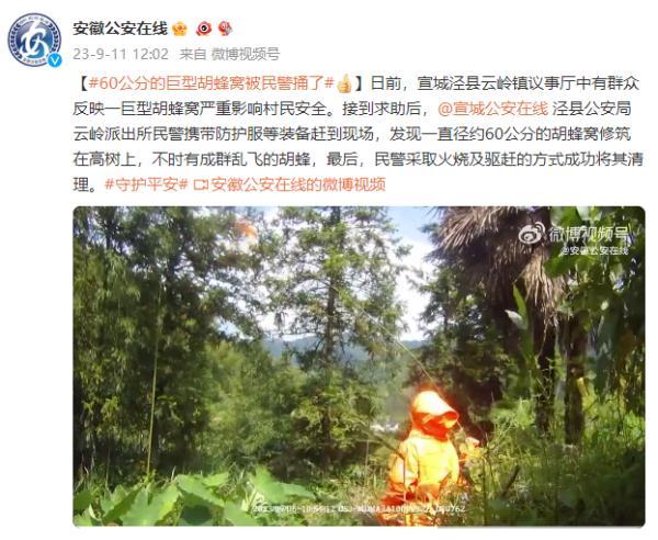 日前,宣城涇縣云嶺鎮議事廳中有群眾反映一巨型胡蜂窩嚴重影響村民安全。接到求助后,@宣城公安在線 涇縣公安局云嶺派出所民警攜帶防護服等裝備趕到現場,發現一直徑約60公分的胡蜂窩修筑在高樹上,不時有成群亂飛的胡蜂,最后,民警采取火燒及驅趕的方式成功將其清理。