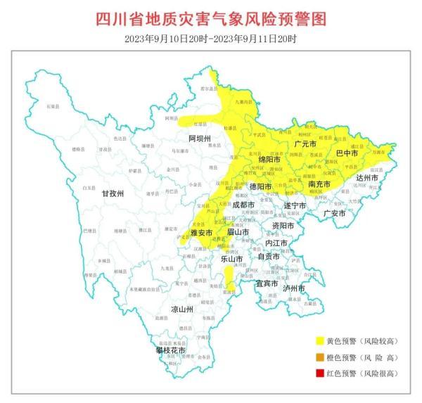 根據(jù)四川省氣象臺天氣預(yù)報(bào)情況,結(jié)合四川省地質(zhì)環(huán)境條件,9月10日20時至9月11日20時,全省地質(zhì)災(zāi)害氣象風(fēng)險(xiǎn)黃色預(yù)警區(qū)域?yàn)閺V元、綿陽等14市(州)的71個縣(市、區(qū))。