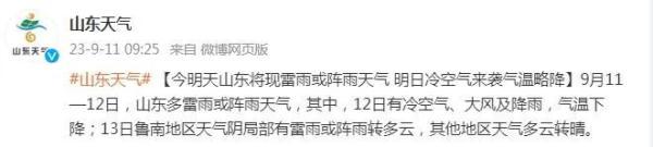據@山東天氣消息,9月11日—12日,山東多雷雨或陣雨天氣,其中,9月12日有冷空氣、大風及降雨,氣溫下降;9月13日魯南地區天氣陰局部有雷雨或陣雨轉多云,其他地區天氣多云轉晴。