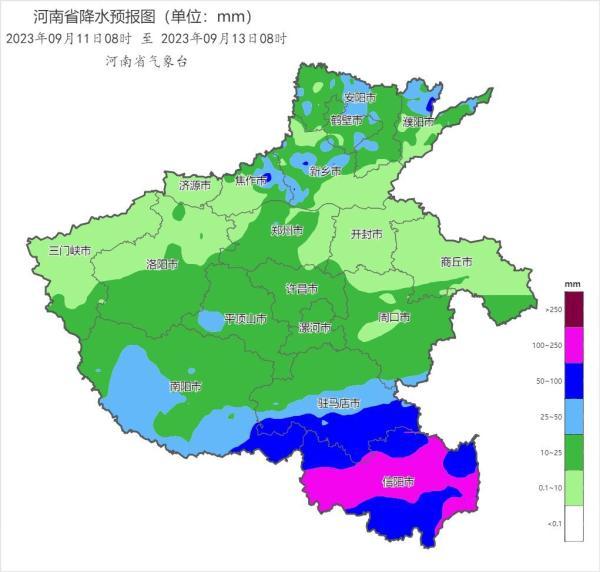 根據預報,11日至12日,河南大部有小到中陣雨、雷陣雨,南部部分縣市大到暴雨,局部大暴雨,黃河以北有分散性短時強降水、雷暴大風等強對流天氣。過程累計降水量:北部、南部25到50毫米,東南部70到120毫米,個別點150毫米以上。小時降水量20到40毫米,局部60毫米。淮河干流及淮南支流面雨量60到90毫米。