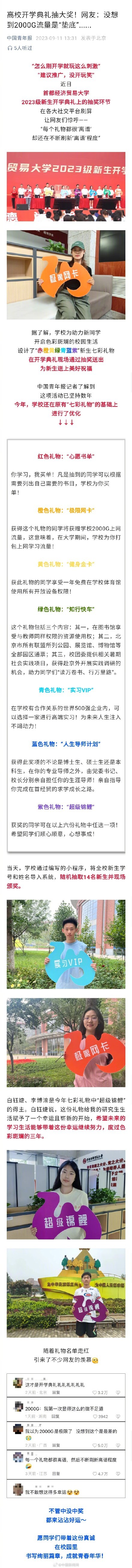 近日,@首都經(jīng)濟(jì)貿(mào)易大學(xué) 2023級(jí)新生開(kāi)學(xué)典禮刷屏。據(jù)了解,學(xué)校為新同學(xué)設(shè)計(jì)了“赤橙黃綠青藍(lán)紫”新生七彩禮物:①紅色禮物“心愿書(shū)單”,凡是抽到的同學(xué)可以根據(jù)需要列出自己需要的書(shū)目,學(xué)校為你買(mǎi)單!②橙色禮物“極限網(wǎng)卡” ,獲得這個(gè)禮物的同學(xué)將獲贈(zèng)學(xué)校2000G上網(wǎng)流量;③黃色禮物“健身金卡”,獲此禮物的同學(xué)享受一年免費(fèi)在學(xué)校體育館使用所有開(kāi)放設(shè)備權(quán)限……網(wǎng)友:這個(gè)值得全國(guó)推廣!(中國(guó)青年報(bào))