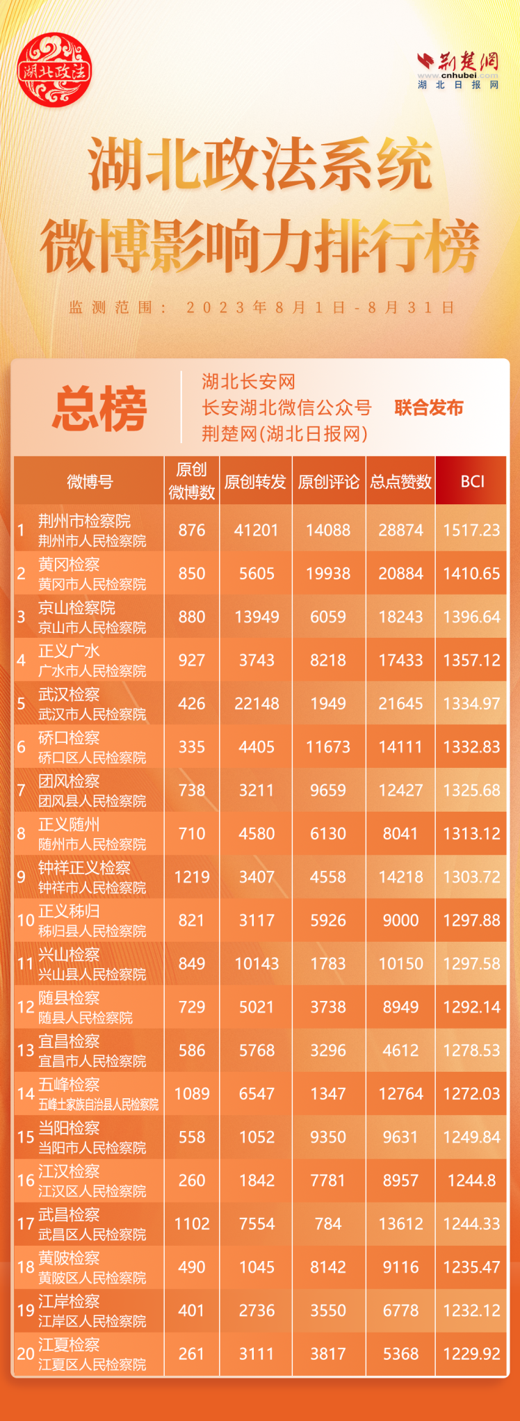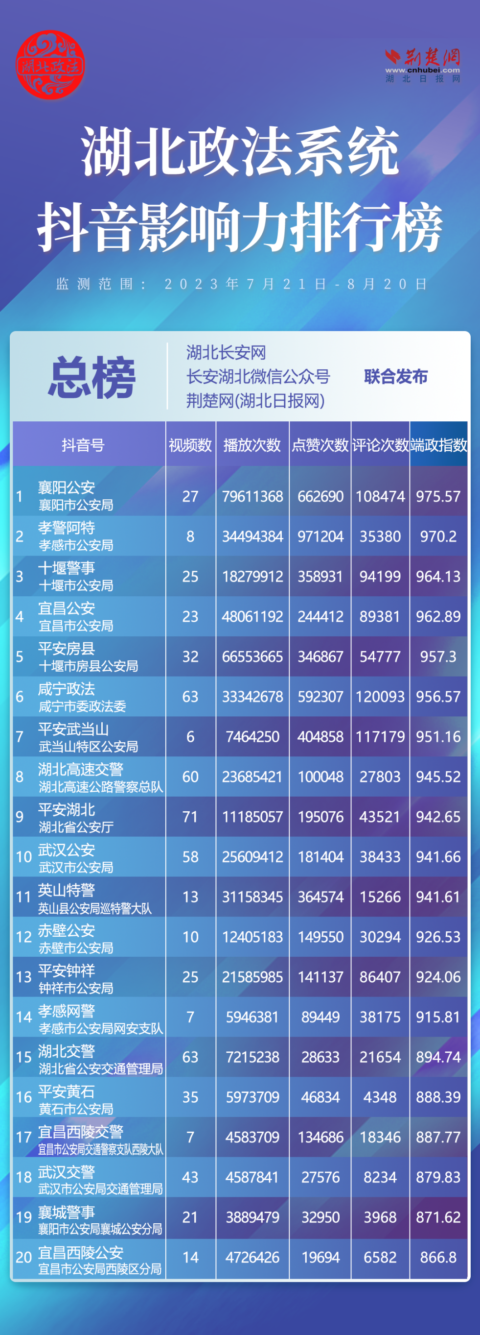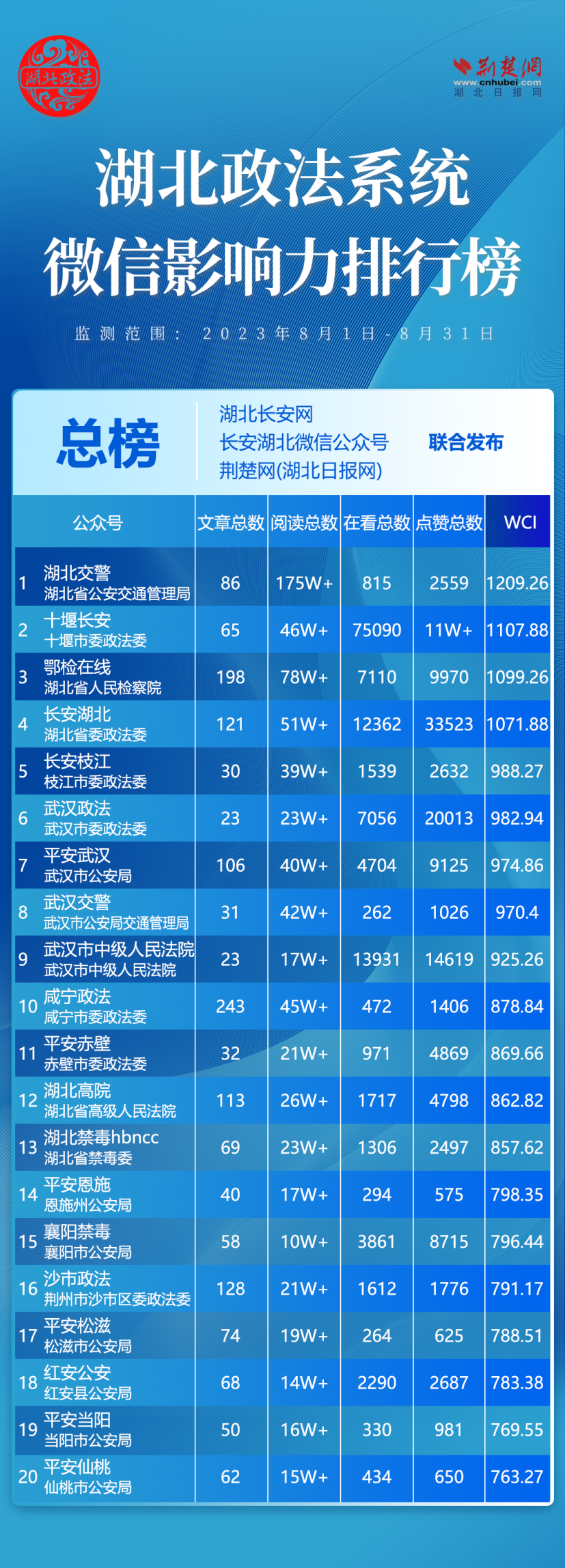 9月11日,湖北省委政法委官網湖北長安網、官微長安湖北,聯合荊楚網(湖北日報網)、楚天輿情數據研究院發布湖北政法系統新媒體影響力排行8月榜單。具體榜單如下: