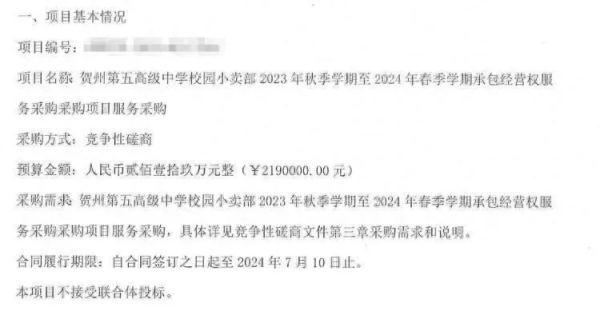 近日,有網友反映稱,今年8月,廣西賀州第五高級中學以219萬元預算,招標該校校園小賣部2023學年—2024學年的承包經營權。