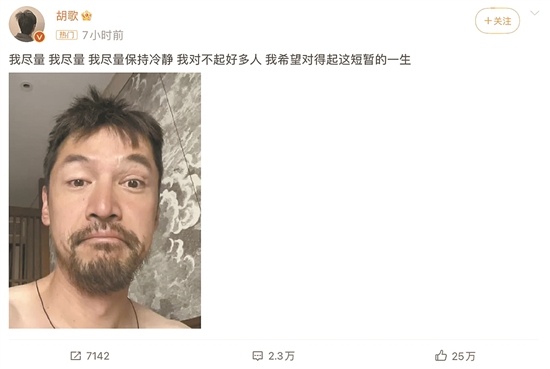 今年8月29日深夜,胡歌發微博:“我盡量,我盡量,我盡量保持冷靜。我對不起好多人,我希望對得起這短暫的一生。”他還配上一張頭發凌亂、胡子拉碴的自拍,左眼的傷疤清晰可見。