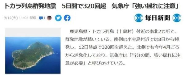據日本《每日新聞》報道,9月8日至12日,日本鹿兒島縣吐噶喇群島持續發生地震,5天內地震超320次。日本氣象部門警告當地可能發生強震,呼吁當地民眾注意。