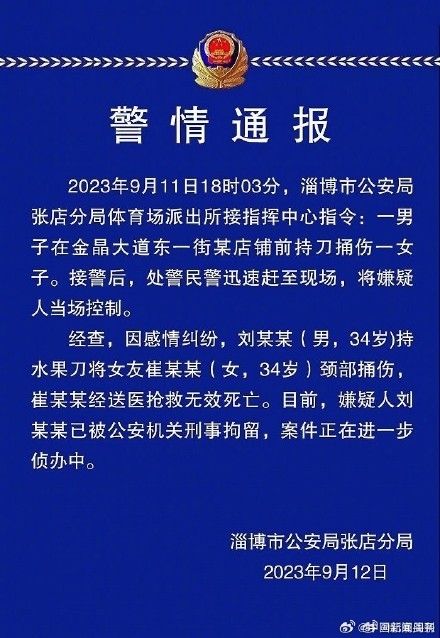 淄博市公安局張店分局9月12日發(fā)布警情通報(bào),2023年9月11日18時03分,淄博市公安局張店分局體育場派出所接指揮中心指令:一男子在金晶大道東一街某店鋪前持刀捅傷一女子。接警后,處警民警迅速趕至現(xiàn)場,將嫌疑人當(dāng)場控制。