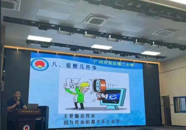 在網友轉發的圖片中,一位主講人站在臺上,身后的大屏幕上播放著課件,課件上有“廣州開發區第二小學”的標識,標題是“提醒幾件事”。網友稱,這是該校召開一年級新生家長會時的現場。