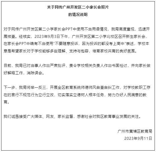 對于網傳廣州開發區第二小學家長會PPT中使用不當用語情況,我局高度重視,迅速開展核查。經核實,2023年9月3日下午,廣州開發區第二小學北校區召開新生家長會,在家長會PPT中確有不當使用“不要隨意投訴,因為投訴的都沒考上高中”表述,學校本意是希望家長對于學校能夠多些理解、支持與包容,培育家校共育的良好氛圍。