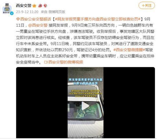 9月11日,西安交警接網友舉報,9月9日南三環東向西方向,一輛白色越野車內有一男童坐在駕駛位手扶方向盤,涉嫌違法駕駛。收到舉報后,事發地轄區大隊民警立即對該消息進行核實。經核查,該車駕駛員不僅存在妨礙安全駕駛行為,而且在行車中未系安全帶。9月11日晚,民警約見該車駕駛員,對其進行了道路交通安全知識宣教,并依法處以罰款250元,駕駛證記4分的處罰。西安交警微提醒:駕駛機動車時車上人員應主動系好安全帶,攜帶幼童乘坐車輛時,應讓幼童乘坐在后排安全座椅當中。