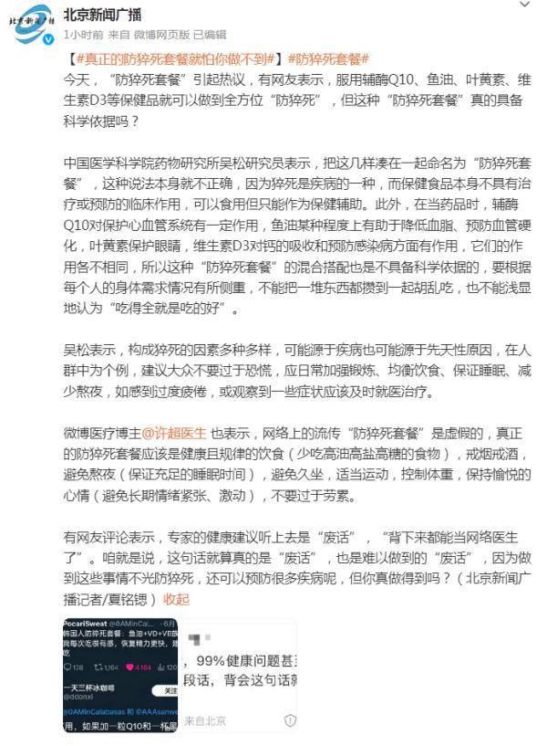 @北京新聞廣播 9月12日消息,最近,“防猝死套餐”引起熱議,有網友表示,服用輔酶Q10、魚油、葉黃素、維生素D3等保健品就可以做到全方位“防猝死”,但這種“防猝死套餐”真的具備科學依據嗎?