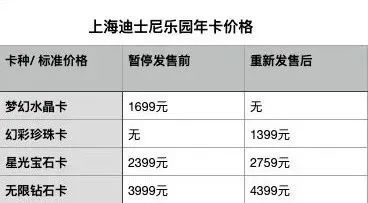 此外,原來售價為2399元的“星光寶石卡”,此次價格上調至2759元;“無限鉆石卡”由3999元上調至4399元。兩卡種分別有15%和10%的價格上調,享受的園區福利與此前基本持平。