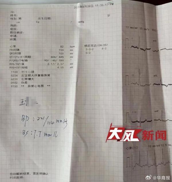 青島市即墨區中醫院8月28日患者心電圖被診斷為異常心電圖,竇性心律,左室肥大伴復極異常,左房增大。