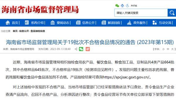 據海南省市場監督管理局網站13日信息,近期,海南省市場監督管理局組織抽檢食用農產品、餐飲食品、糧食加工品、豆制品共 4類產品664批次,其中合格樣品645批次,不合格樣品19批次(檢測項目見附件)。發現的問題主要包括農藥殘留、獸藥殘留和餐飲食品中食品添加劑不合格。
